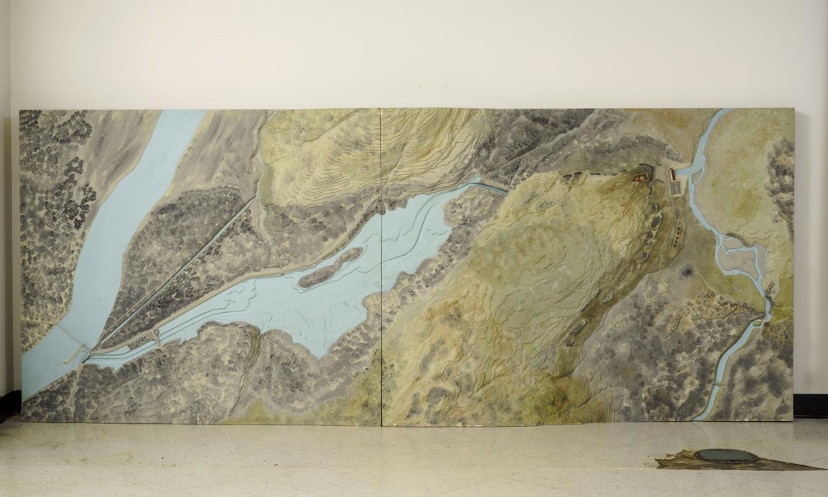 Líkan af Búrfellsvirkjun. Gert eftir frumteikningum. Gifsverk í tréramma. Málað. Verkið var lágrétt, með fótum undir. Fæturnir eru ekki lengur til og verkið stendur upp á hlið. Líkanið er samsett úr tveimur hlutum. Annar þeirra er 169.5 cm að lengd og hinn 149.5 cm.