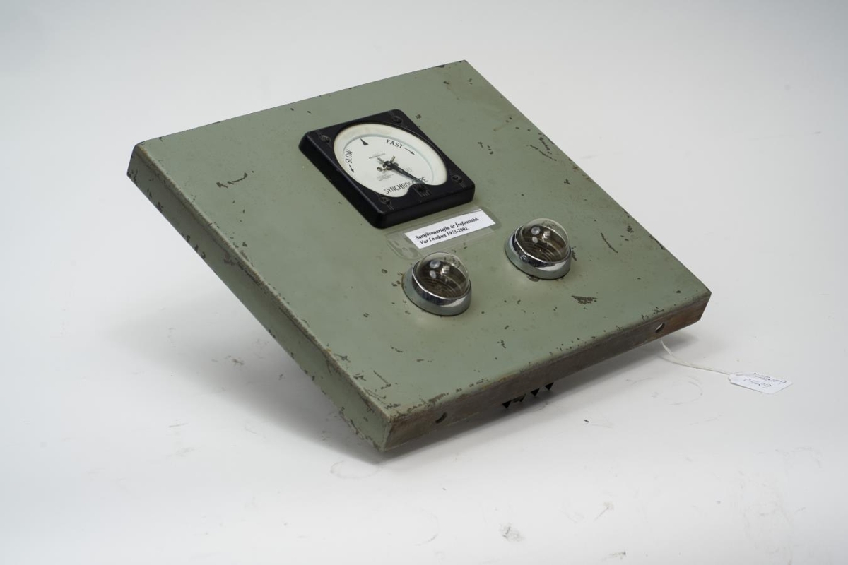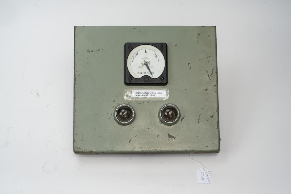 Tafla notuð til samfösunar á vélum og spennum í Írafossstöð við tilheyrandi net. Á töflunni eru hraðamælir og samfösunarljós.