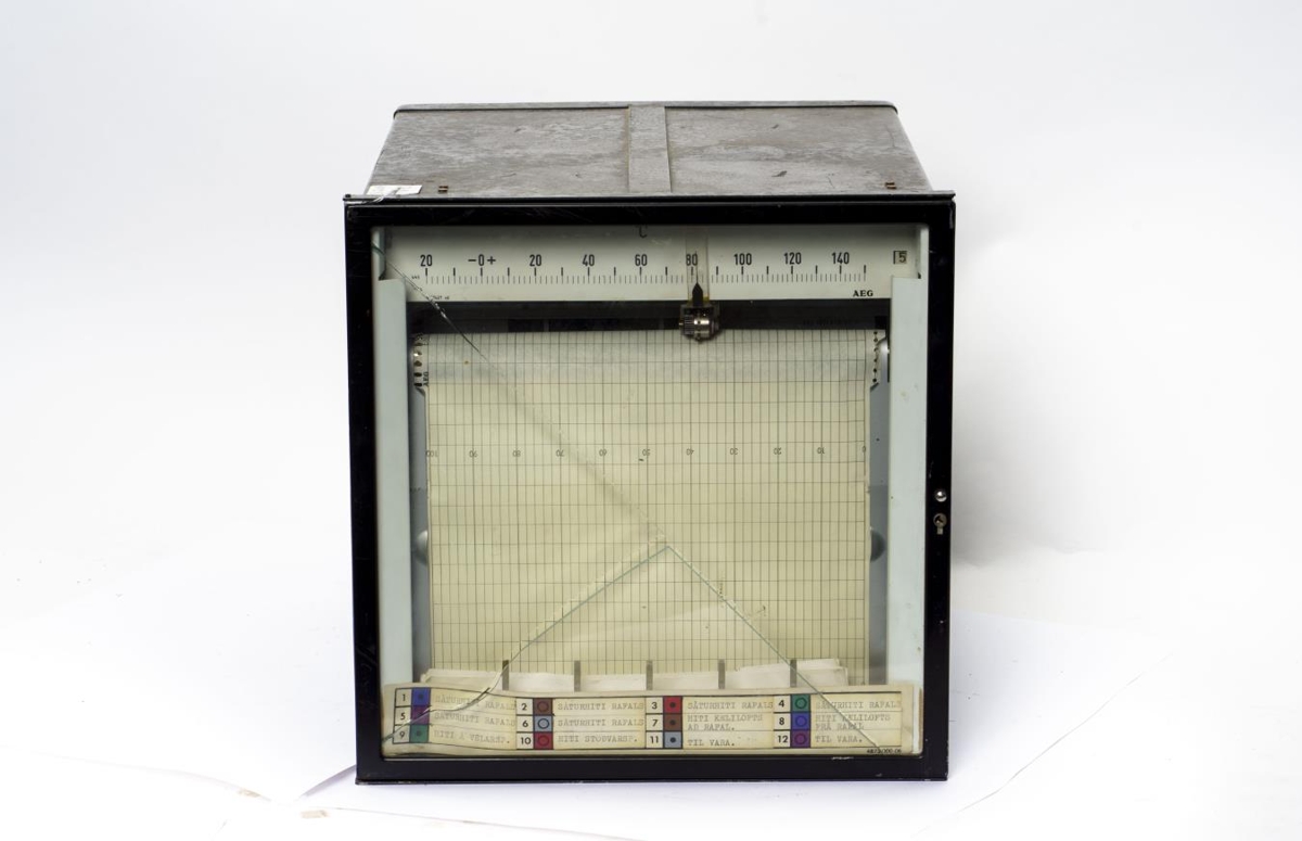 Kassi með glerhurð framan á. Í kassanum er síriti og upplýsingar hans má lesa af pappír í gegnum glerið. Inni í kassanum, undir síritanu7m er geymdur leiðbeiningabæklingur með tækinu.