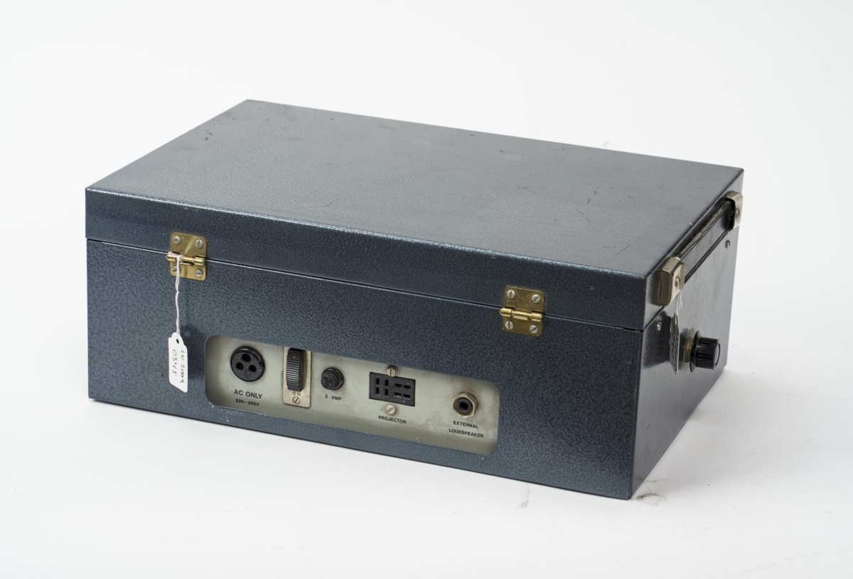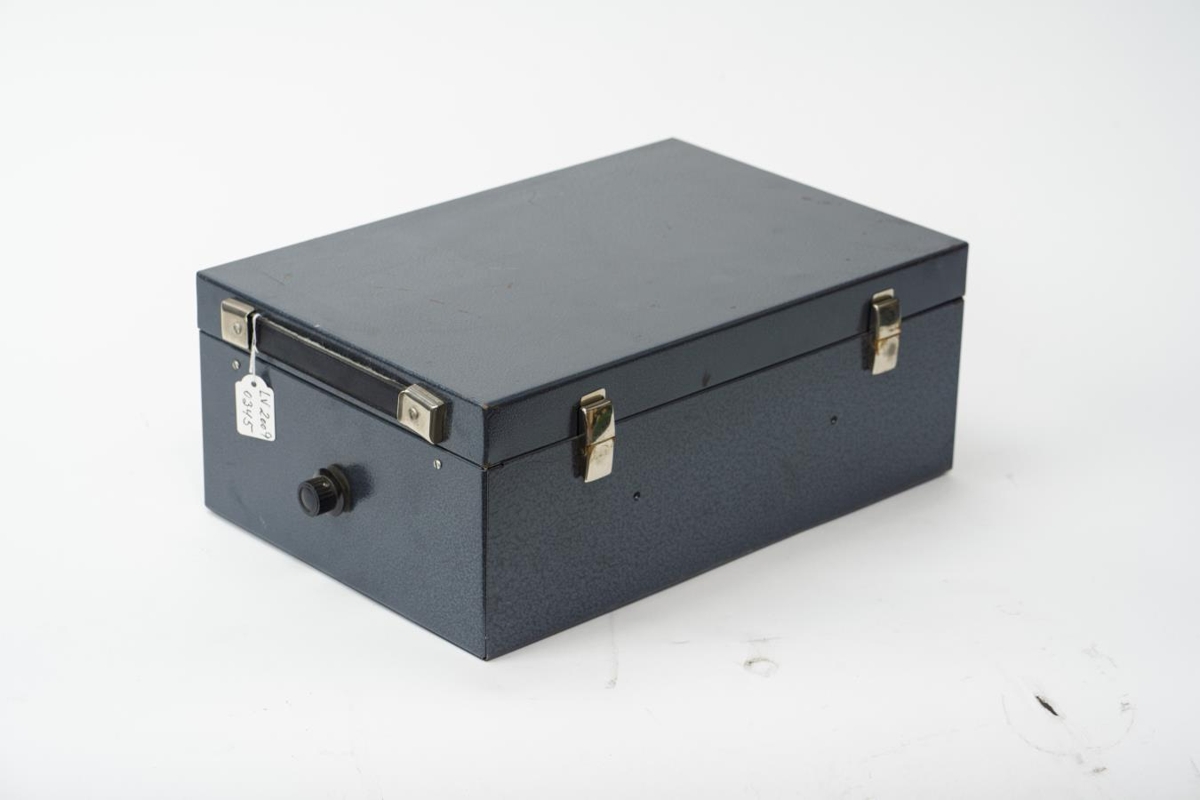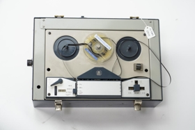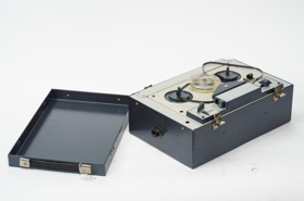 Tæki með tveimur spólum til að spila bönd. Tækið er í járnkassa m. loki og handfangi.