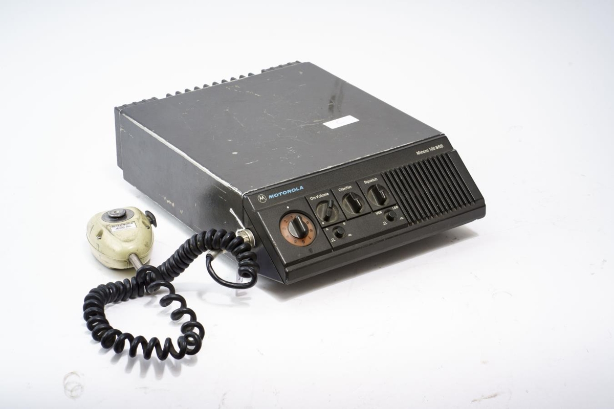 Takkar, stillingar og hátalari framan á tækinu. Motorola hljóðnemi er tengdur við tækið með gormasnúru.