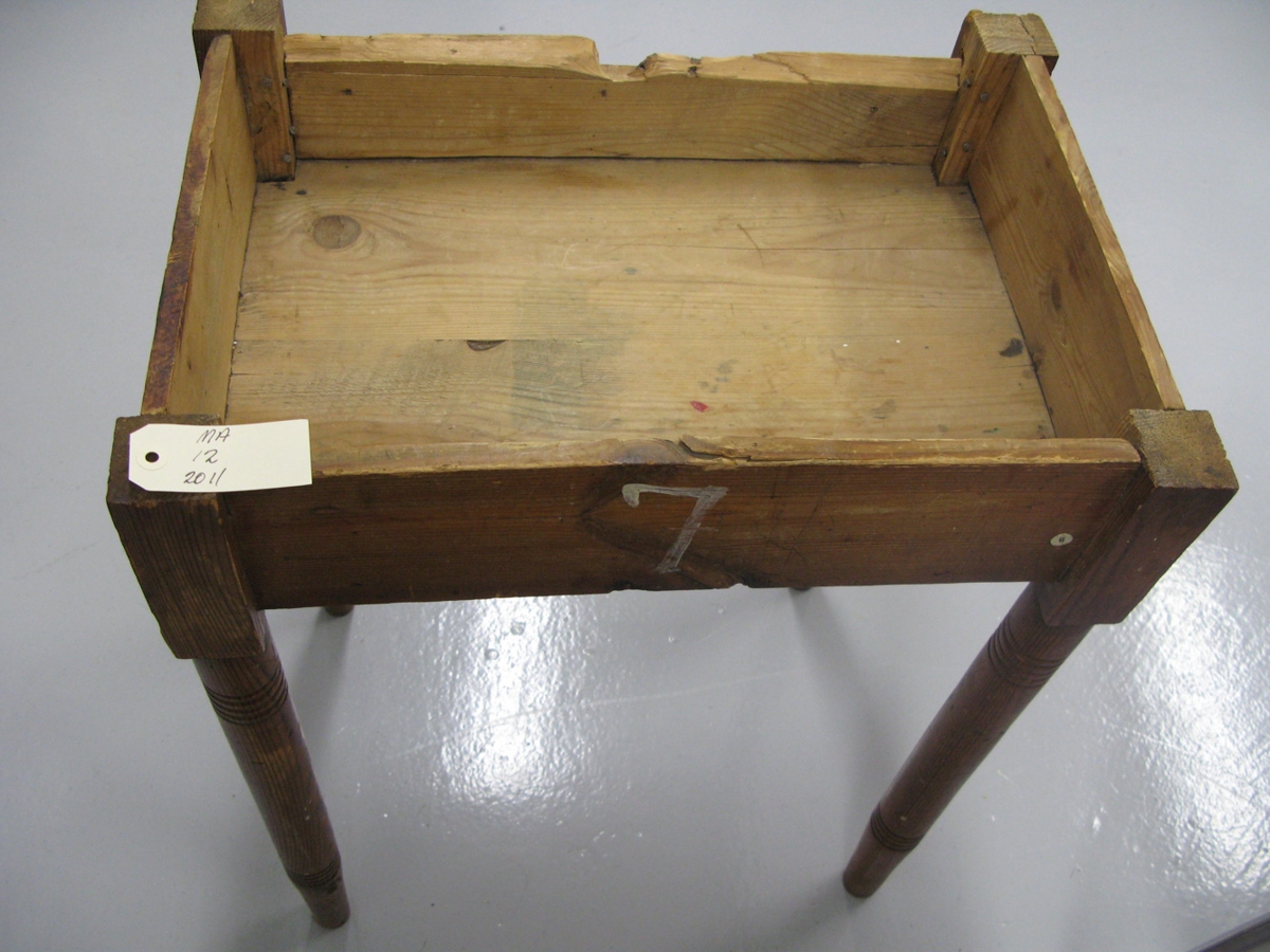Lítið skólaborð sem er viðarlitað. Borðplata sem var á lömum er ekki til staðar. Er eins og MA-2010-810. Þetta borð er að öllum líkindum úr Hússtjórnarskólanum í Mjóanesi og Hallormsstað. Borðið kom fram þegar tekið var til hér í geymslu og hefur að öllum líkindum komið um leið og MA-2005-5 og 6. Stafurinn 7 er málaður framan á borðið.
