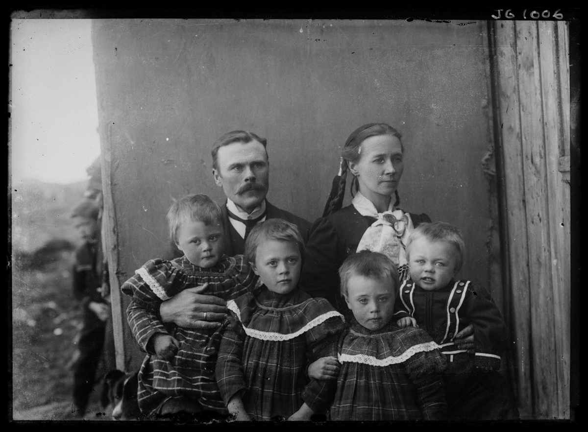 „Myndin er líklega tekin 1911-1912, því Halldór fæddur 1912 er ekki með á myndinni, en Höskuldur fæddur 1910 er á myndinni. Börnin eru Lóa Fanney f. 1909, Guðrún f. 1906, Steinunn f. 1907 og Höskuldur f. 1910 Jóhannesbörn.“ (VE 2020)