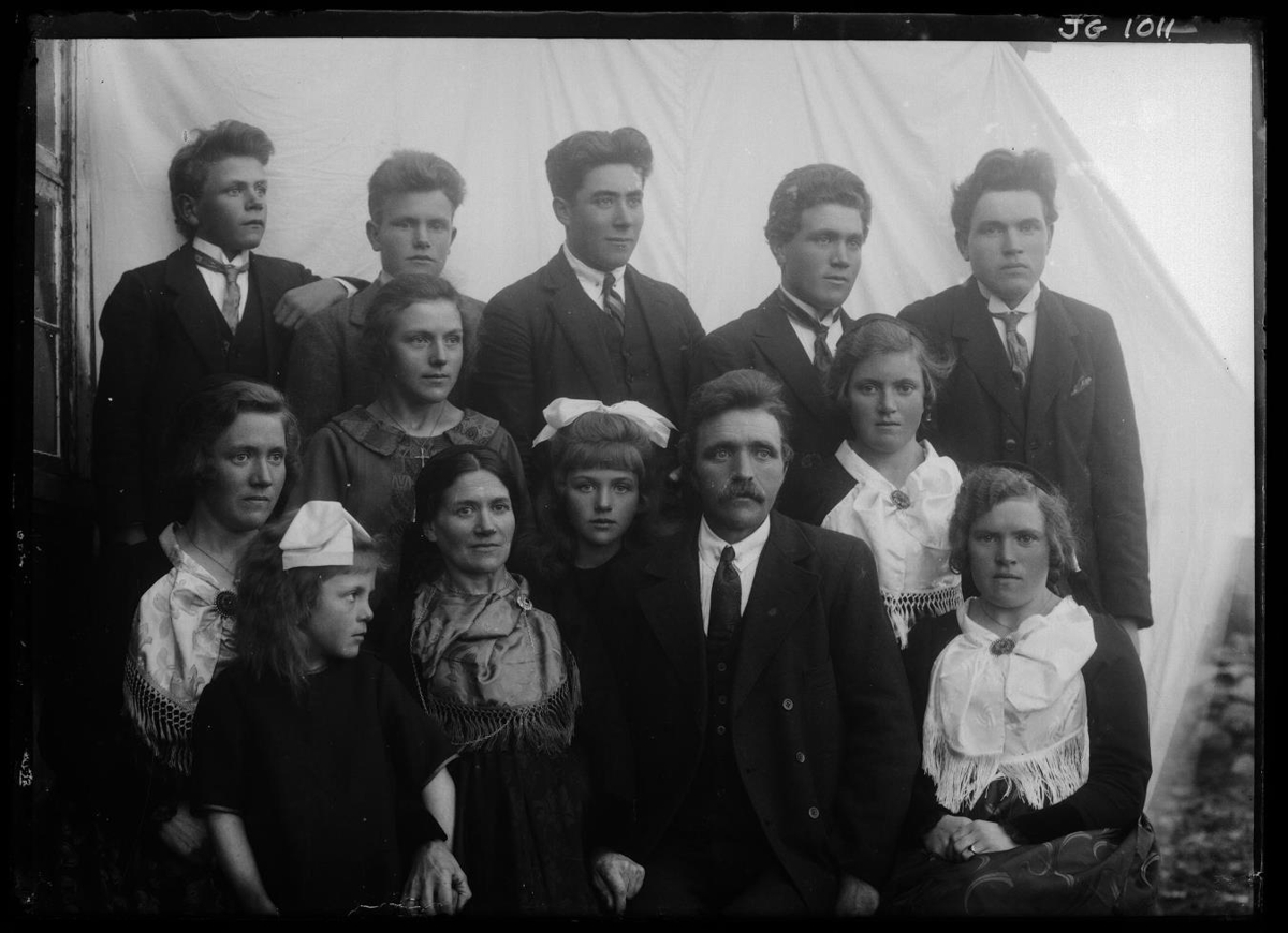 13 Halldór Guðmundsson, Magnússkógum, bóndi, Ingibjörg Jensdóttir, húsfreyja kona hans, börn þeirra, Snorri Halldórsson, efri röð f.v., Sigurjens Halldórsson, Alfons Oddsson, uppeldissonur, Guðmundur Halldórsson, Magnús Halldórsson, Elísabet Halldórsdóttir, neðri röð f.v., Jóhanna Halldórsdóttir, Salbjörg Halldórsdóttir, Jensína Halldórsdóttir, Sigríður Halldórsdóttir, Magnússkógum, Kristín Halldórsdóttir.