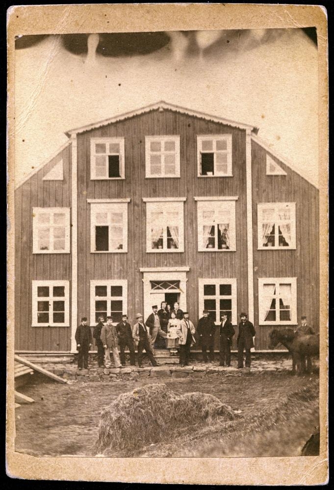 14 saman. Fyrir framan Thorlacius húsið í Sthólmi (frá vinstri) Hans Schiödt, Ebenezer snikkari, Helgi Helgason ("væni") sem byggði húsið, Samúel Richter, Þorsteinn Egilsson, Egill Egilsson, frú Jósefína Thorarensen, sýslumannsekkja, Frú Egilson (líkl. fyrri kona Egils, Anna María Guðrún, f. Thorlacius), Daniel Thorlacius, Benedikt Benediktsson, "rúðumeistari", Guðmundur Pálsson, sýslumaður, og Ólafur Thorlacius (óþekkt er stúlkan á miðri myndinni og maðurinn við hestinn