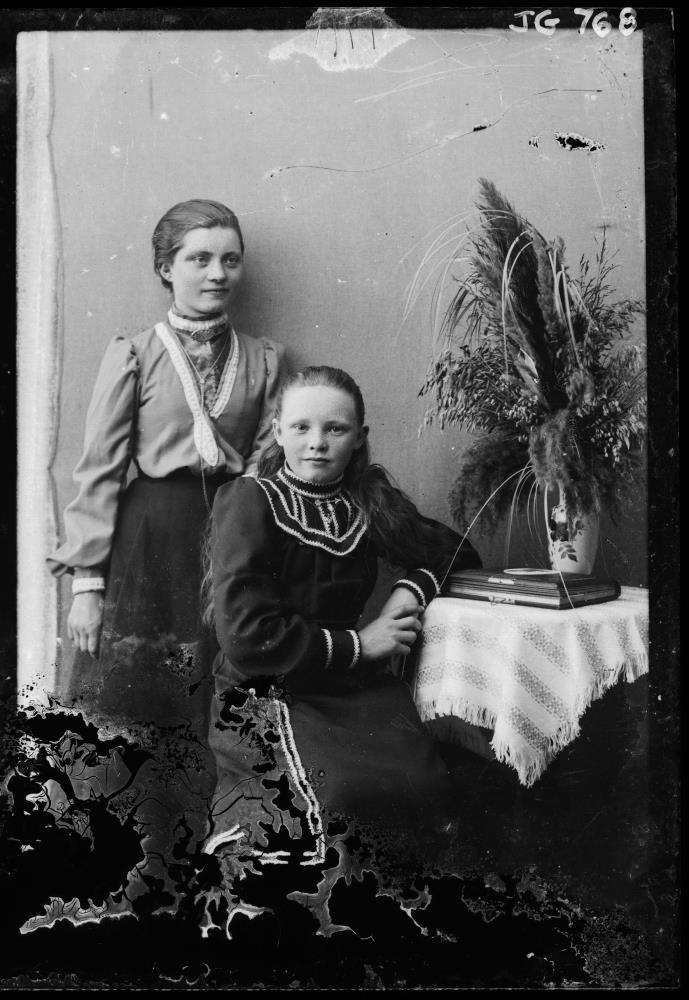 2 telpur, sama mynd og nr. 767. Systurnar Guðlaug Sigurðardóttir (situr) læknisfrú og Guðrún Sigurðardóttir (stendur) símstöðvarstjóri í Búðardal. Faðir þeirra var Sigurður Sigurðsson héraðslæknir á Hrappsstöðum og í Búðardal og móðir þeirra var Ragnheiður Vigfúsdóttir.