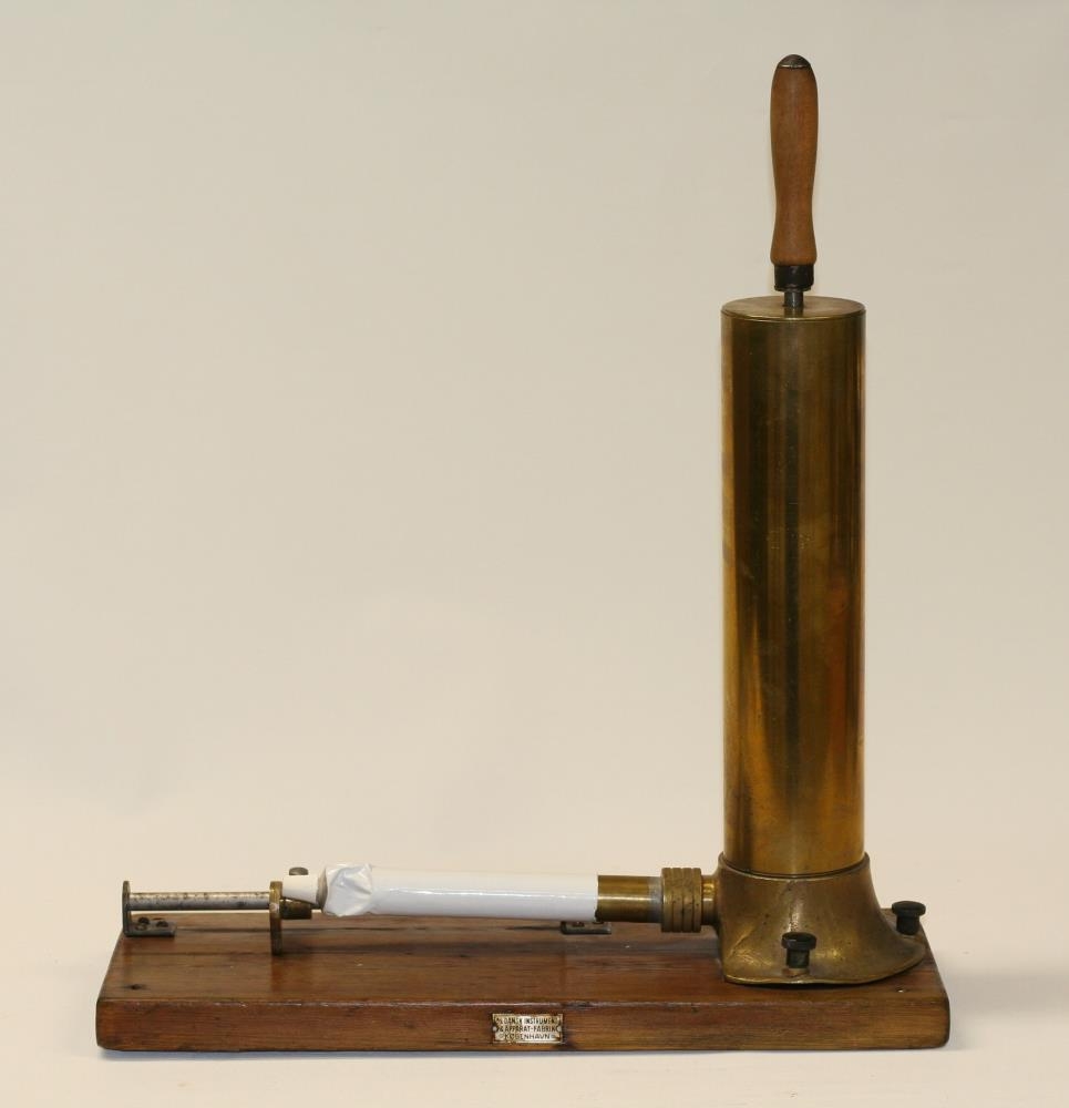 háu koparröri sem er skrúfað fast, lórétt á tréplötu, stimpli sem er þrýst