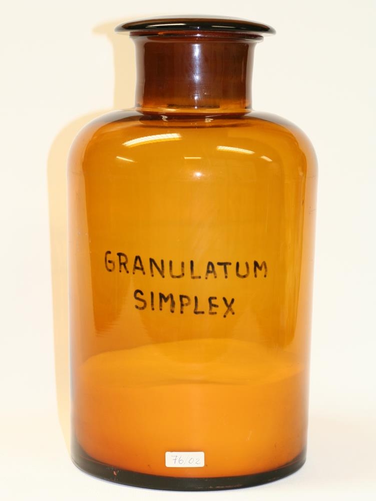 Stútvítt brúnt standglas með slípuðum glertappa sem notað var undir duft. Á glasinu er áletrunin Granulatum simplex og er glasið hálffulllt af efninu sem er grunnefni við töflugerð.