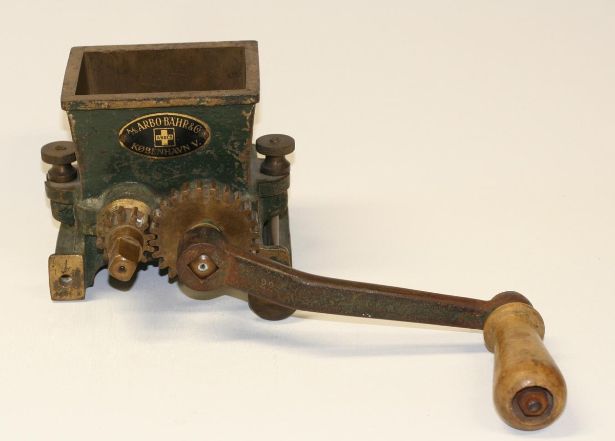 Hnoðari fyrir pilludeig. Á hann vantar einn prjón. Ferkantaður málm ferningur með tveimur eir (kopar) völsum og utanvert tveimur tannhjólum og sveif. Þegar sveifinni er snúið þrýstist pilludeigið niður á milli valsanna og blandast. Gert er ráð fyrir að skrúfa áhaldið fast við borðplötu.
