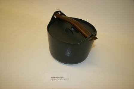 Pottur úr steypujárni. Hefur handfang úr viði sem er laust og hægt er að nota til að taka lokið af eða færa pottinn til.