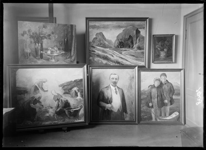 Sex málverk uppstillt við vegg. Eitt er af uppstillingu, annað af Vestmannaeyjum, eitt af tveimur stelpum og annað af konum í Þvottalaugunum og enn eitt af karlmanni. Kristín Jónsdóttir.