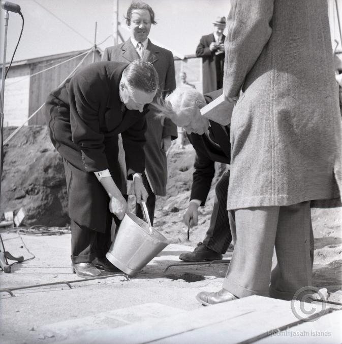 Østergaard verkfr. með fötuna, Jón Pálmason múrar, Gunnar Thoroddsen á bak við.