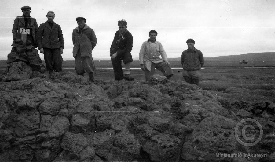 Sex menn stilla sér upp til myndatöku í óbyggðum. Ólafur B. Jónsson lengst t.v. hefur tekið bílnúmerið A 80 af bílnum og festa komið fyrir á vörðu.