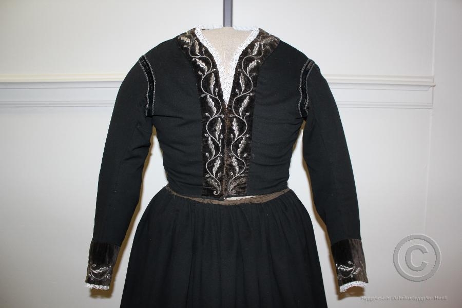 Skauttreyjan er úr svörtu ullarklæði, klædd að innan með ljósbrúnu bómullarvaðmáli. Hún er aðskorin og nær niður í mitti. Hún er með löngum þröngum ermum og þær eru fóðraðar með röndóttu bómullarefni. Á boðungum og upp um hálsmálið er 4,5-4,8 cm breið flauelsbrydding sem er brún að lit en hefur upprunalega verið svört. Á bryddingunum er baldering með silfurþræði. Á ermalíningum sem eru bogadregnar er 8,6 cm breiður flauelskantur, einnig með baldýringu. Á axlarsaumum, á baki og í handvegum eru svartar flauelsleggingar skreytar með knipplingum úr vírþræði, samskonar og er í baldýringunni. Treyjan er krækt að framan með 17 krækjum. Lengd treyjunar að neðan og að handvegi er 19,3 cm. Lengd að neðan og að efri brún á hálsmáli er 37,5 cm. Hvít nælonblúnda í hálsmáli og framan á ermun er seinna tíma verk.