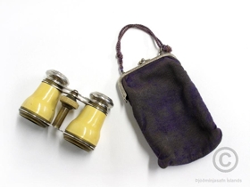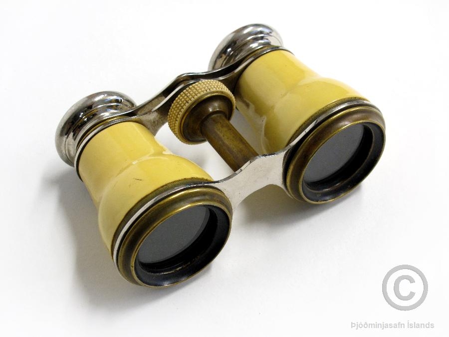 Leikhúskíkir í veski úr fjólubláu flaueli. Kíkirinn er úr málmi (járni og koparblöndu), klæddur með beinlitu plastefni. Til að stilla fókusinn er litlu beinhjóli milli sjónpípanna snúið og þá dragast sjónpípurnar út. Í innstu stillingu er kíkirinn 6,8 cm langur en í þeirri ystu er hann 8,9cm langur. Veskið sem sjónaukinn er í er eins konar vindlingaveski og er með málmspennu á. Flauelið er orðið mjög snjáð. Í veskinu hangir fjólublá snúra. Kíkirinn er í mjög góðu ástandi.
