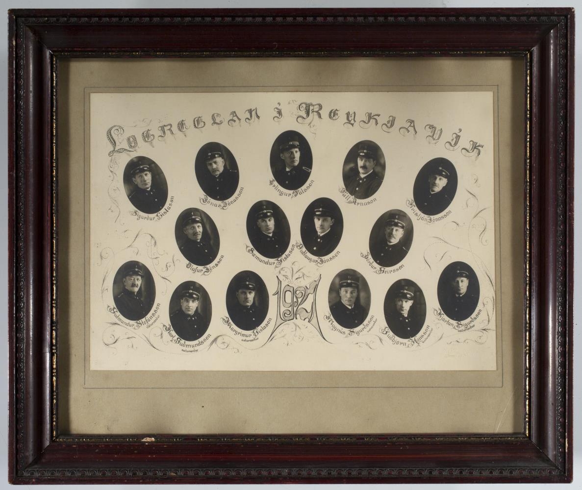 Myndaspjald. Myndaspjald með 15 myndum, rammi brúnn, lakkaður með gylltri rönd, stærð: 30 x 25,4 cm: Lögreglan í Reykjavík 1927. Efst: Sigurður Gíslason, Jónas Jónasson, Erlingur Pálsson, Páll Árnason og Kristján Jónasson. Í miðröð: Ólafur Jónsson, Sæmundur Gíslason, Guðlaugur Jónsson og Þórður Geirsson. Neðst: Guðmundur Stefánsson, næturvörður, Karl Guðmundsson, næturvörður, Margrímur Gíslason, næturvörður, Magnús Sigurðsson, næturvörður, Guðbjörn Hansson, næturvörður og Kjartan Sigurðsson næturvörður.