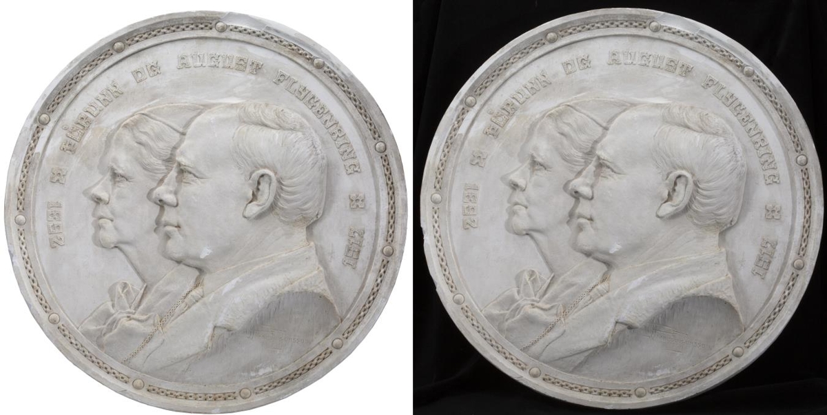 Vangamyndir tvær saman, úr gipsi, upphleyptar, af Aug. Flygenring, kaupmanni í Hafnarfirði (albróður gefanda), og konu hans, Þórunni Stefánsdóttur. Myndin gerð af Ríkarði myndasmið J'onssyni fyrir gefanda á silfurbrúðkaupsdegi þeirra hjóna.