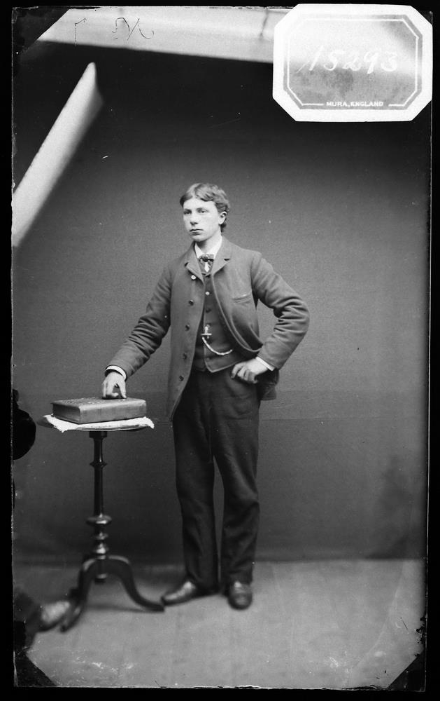Ungur maður stendur við borð og styður hendi á albúm sem hvílir á borði. Hann er í jakkafötum og vesti, hvítri skyrtu og með slaufu. Úrkeðja er framan á vesti.