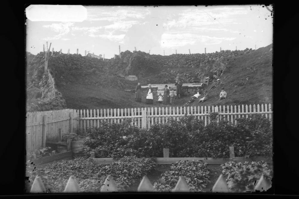 Í garðinum við hús Chr. Zimsens Hafnarfirði 1884. Barnfóstran Anna Zimsen, gift Larsen, Laura Z. ógift í Danmörku, frú Cathinca kona Chr. Zimsens, Jes Zimsen Reykjavík, Chr. Zimsen faktor með Kristin son sinn, Hafsteinn Zimsen dó ungur, Jóhanna Z. dó ung, Cathinca Z. gift Jóhannesi Sigfússyni adjunkt, Knud Z. borgarstjóri og Louise Z. ógift í Danmörku.