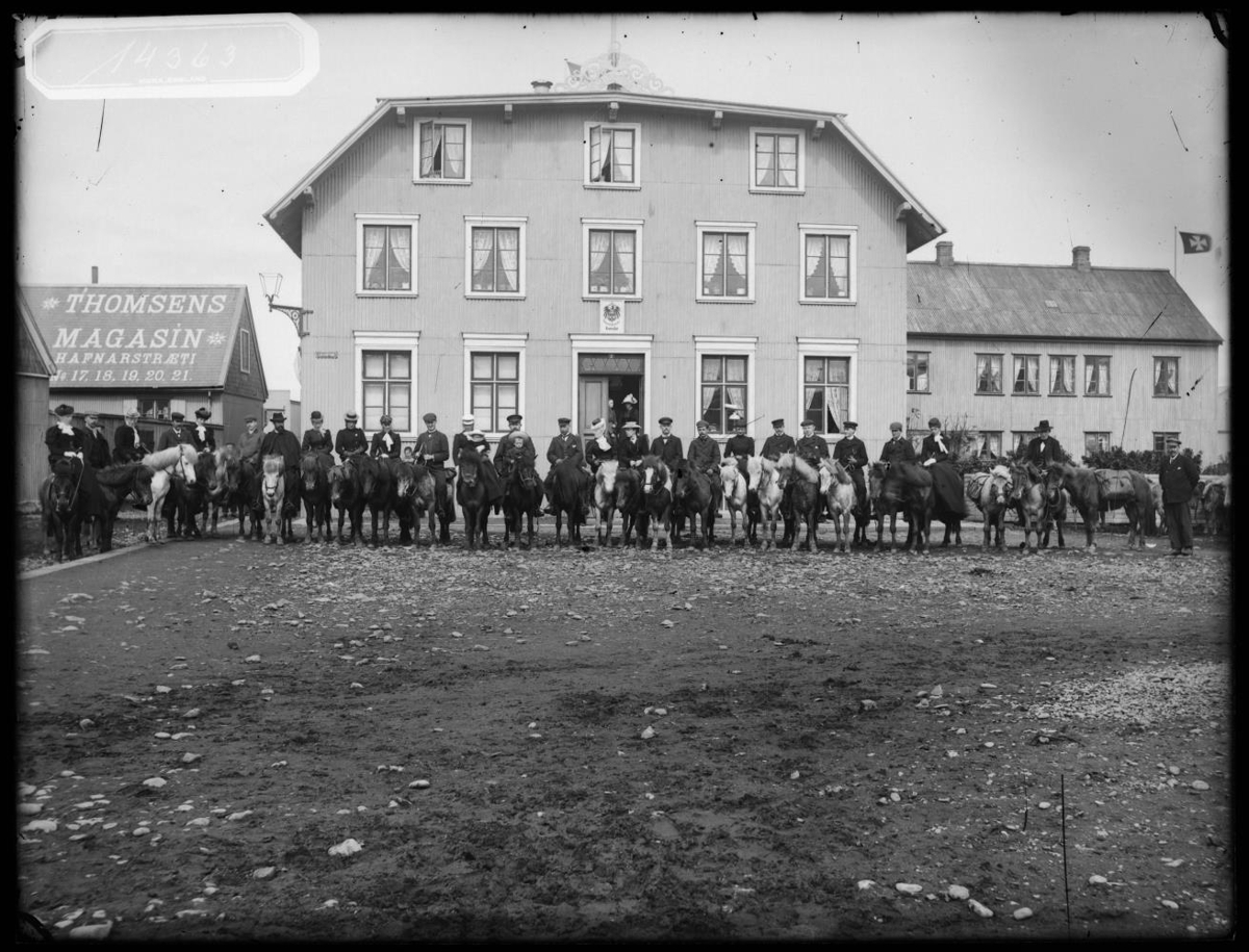 Hópmynd af skemmtiferðafólki úr Reykjavík á hestbaki: Frú Erica Gíslason síðar bæjarfógetafrú á Ísafirði?, Flora Zimsen borgarstjórafrú, Séra Friðrik Friðriksson forstj. K. F. U. K. fröken Sigríður Björnsdóttir ritstjóra, Bentína Hallgrímsson (kona séra Friðriks Hallgrímssonar) Cathinca Sigfússon fædd Zimsen, Gísli Skúlason prestur að Stóra-Hrauni, Augusta Thomsen (Hallgrímsdóttir biskups), Ditlev Thomsen kaupmaður og konsúll, Oddur Gíslason síðast bæjarfógeti á Ísafirði, Kristín Þórðardóttir, frú Frederikke Briem, frú Elina Sveinsson biskupsfrú, Ludvig Kaaber, Louise Zimsen, Ragnheiður Zimsen kona Jes Zimsen, Tómas Jónsson, Árni Jónsson timburkaupmaður, Friðrik Hallgrímsson, Kristinn Zimsen ofl.