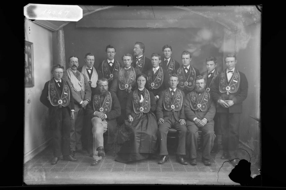 Hópmynd af Góðtemplurum á stórstúkuþingi í Reykjavík 1901, með einkenni: Jakob Jónsson verslunarmaður, Þorlákur Ó Johnsen kaupmaður, Björn Kristjánsson? kaupmaður, Guðlaugur Guðmundsson?, Magnús Zakaríasson, Jón Ólafsson ritstjóri, Oddur Björnsson prentsmiðjustjóri, Konrad Maurer, Þorvarður Þorvarðarson, Jónas Jónsson („Máni“), Schou steinhöggvari, Guðrún Guðmundsdóttir í Gróubæ, Árni Eiríksson kaupmaður og Helgi Teitsson.