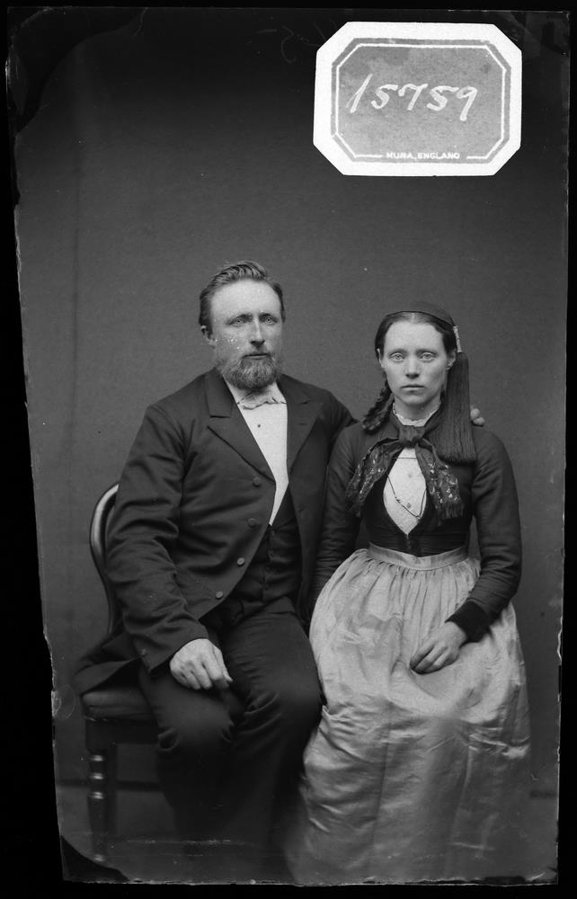 Skeggjaður maður í síðjakka situr við hlið konu á peysufötum. Hann leggur hendina á öxl hennar.