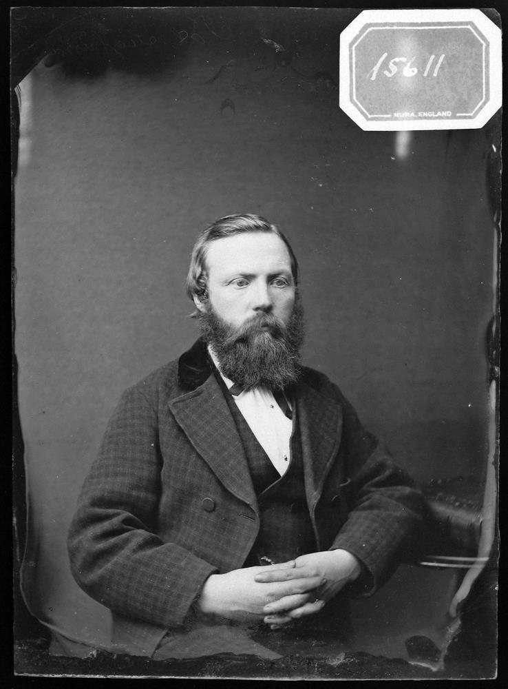 Skeggjaður karlmaður í köflóttum fötum, jakka, vesti og buxum. Svar klæði er á jakkakraga. Hann er í hvítri skyrtu með slaufu.