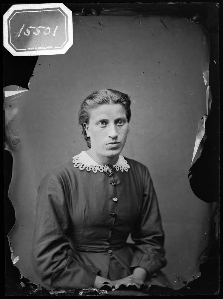 Kona í hnepptum kjól með lausum hvítum kraga.