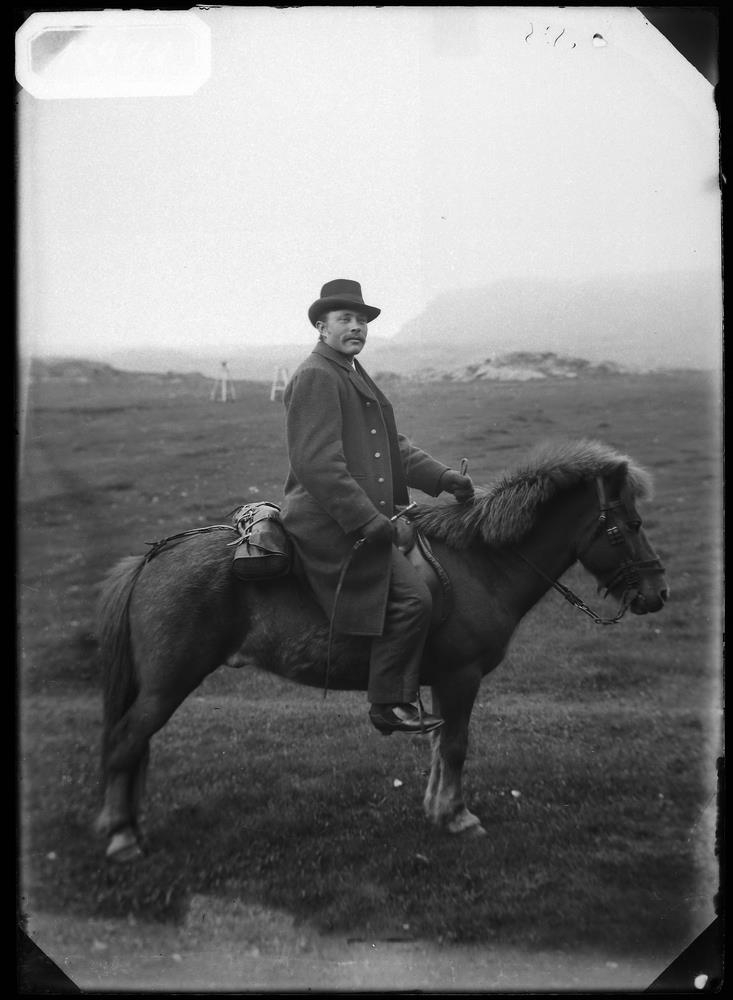 Karlmaður með hatt á hestbaki. Hann er í frakka og með hanska/vettlinga á höndum og heldur á svipu í annarri hendi en um tauminn í hinni. Sér til veðurmælingatækja í bakgrunni.