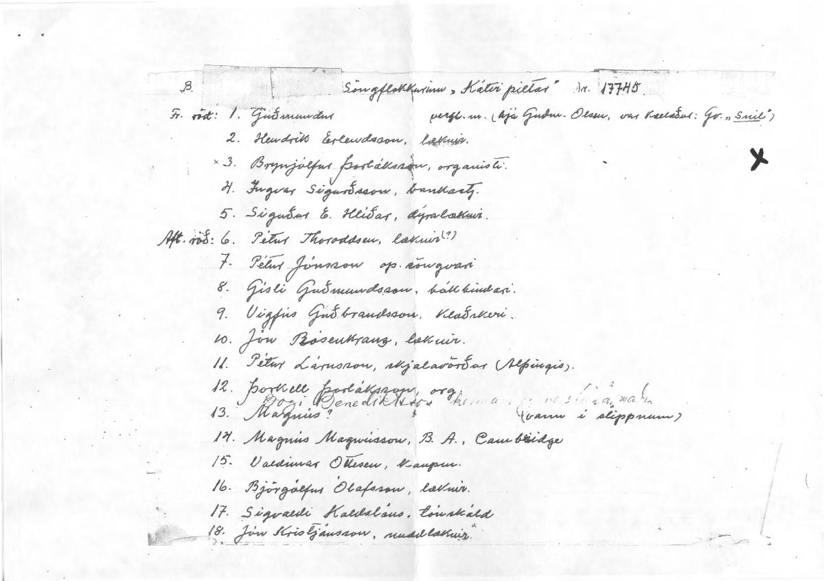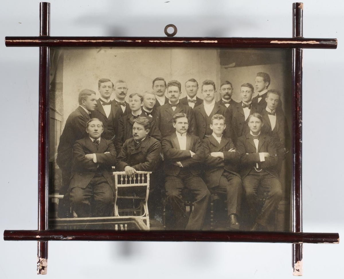 Ljósm.spjald í brúnlakkeruðum ramma, með 3 cm löngum tindum á hornum, breidd 1 cm, stærð 22,6 x 17,6 cm: Söngflokkur. "Kátir piltar". Nafnaskrá fylgir.