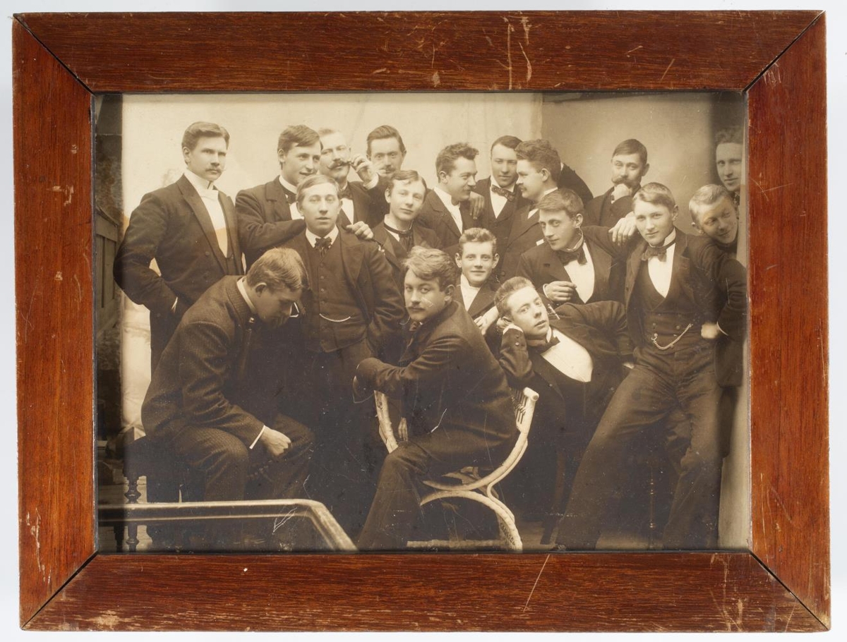 Ljósm.spjald í mahógníramma, breidd 2,5 cm, stærð 26 x 19 cm: Söngflokkur. "Kátir piltar". Nafnaskrá fylgir.