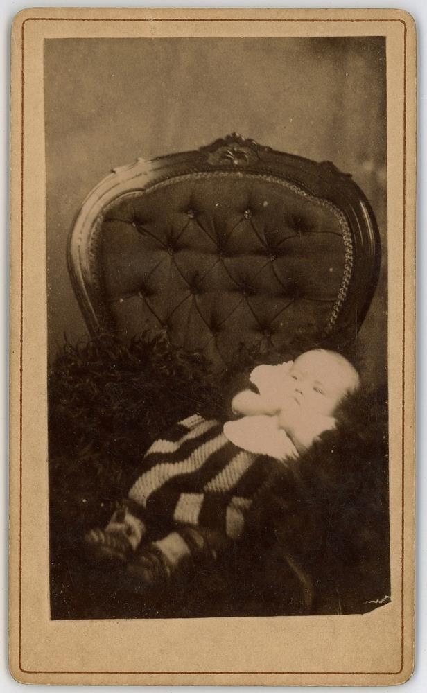 Lítið barn liggur á gæru í bólstruðum stól.