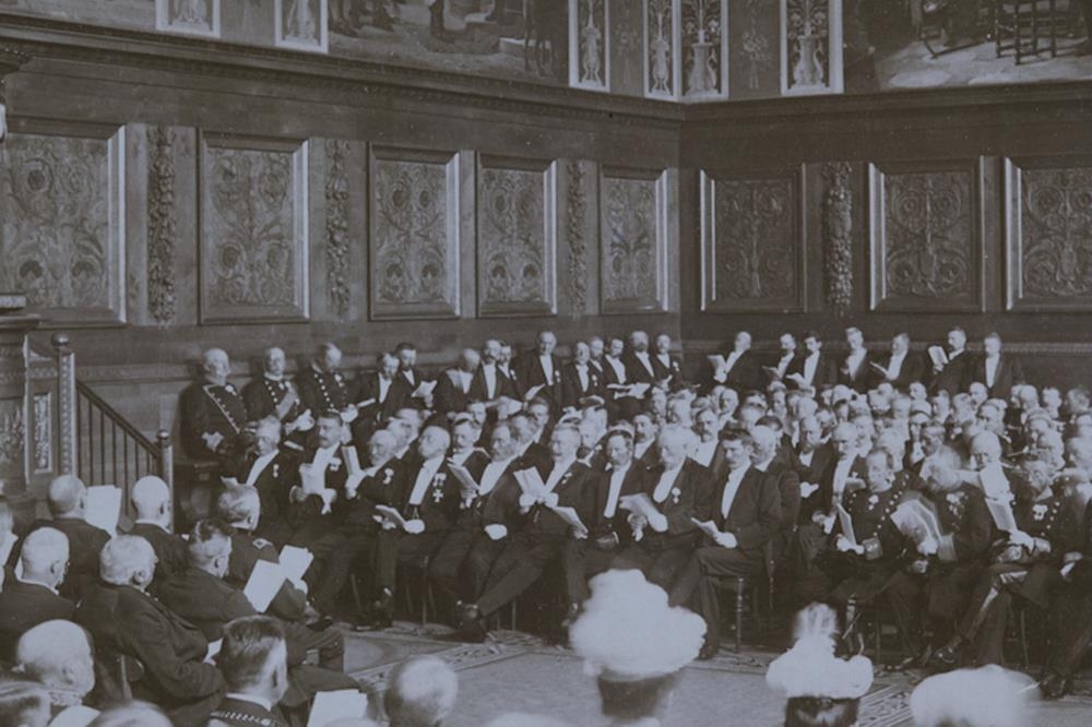 á blaði sem flestir halda á í hendi. Yst t.h. er stúka eða ræðupallur.