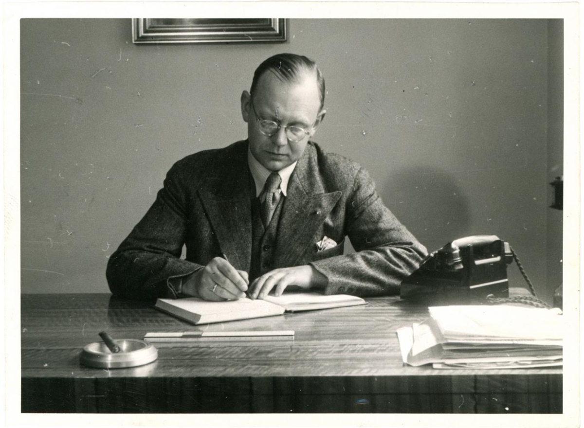 Karlmaður í jakkafötum og með gleraugu situr við skrifborð og skrifar í bók. Á borðinu er sími, pappírar og öskubakki með vindli í.