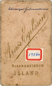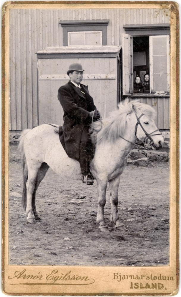Ebeneser Guðmundsson, trésmiður í Búðardal. Á hesti fyrir framan hús. Í baksýn gægjast tvær stúlkur útum glugga á húsinu. T.h. er Ingileif Zoëga, við hlið hennar er systir hennar (óvíst hver þeirra).