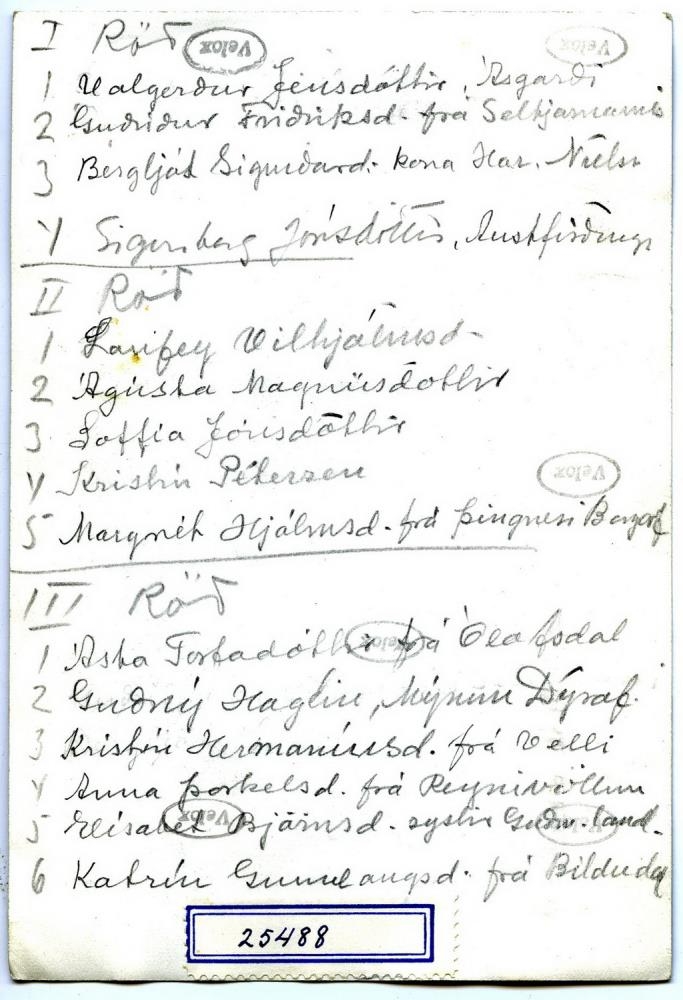 Röð III: Ásta Torfadóttir frá Ólafsdal, Guðný Hagalín, Kristín Hermannsdóttir frá Velli, Anna Þorkelsdóttir frá Reynivöllum, Elísabet Björnsdóttir, systir Guðmundar landlæknis, Katrín Gunnlaugsdóttir frá Bíldudal.