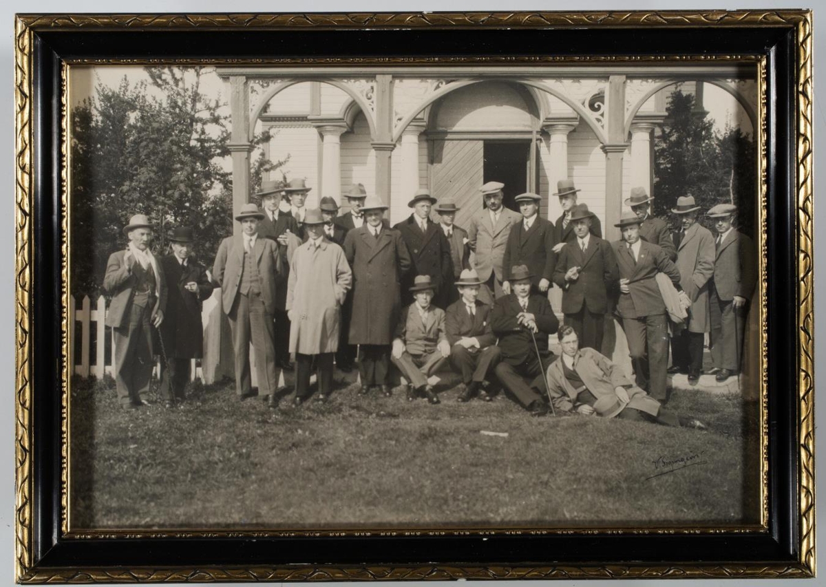 Hópmynd tekin fyrir framan Grundarkirkju í Eyjafirði, líklega frímúrarar.