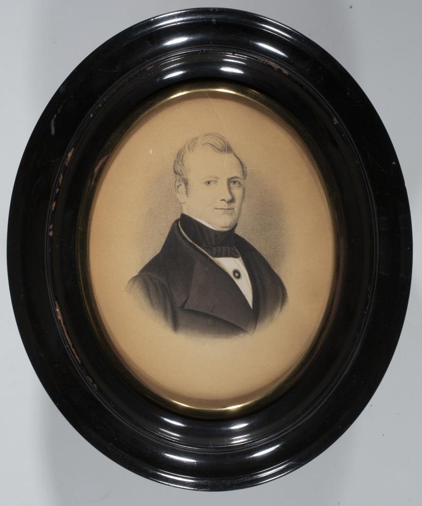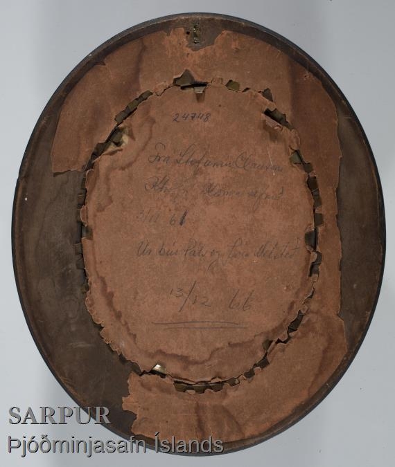 Blýantsteikning/tússteikning eða ljósmynd af málverki, sem teiknað hefur verið ofan í, sporöskjulöguð mynd.