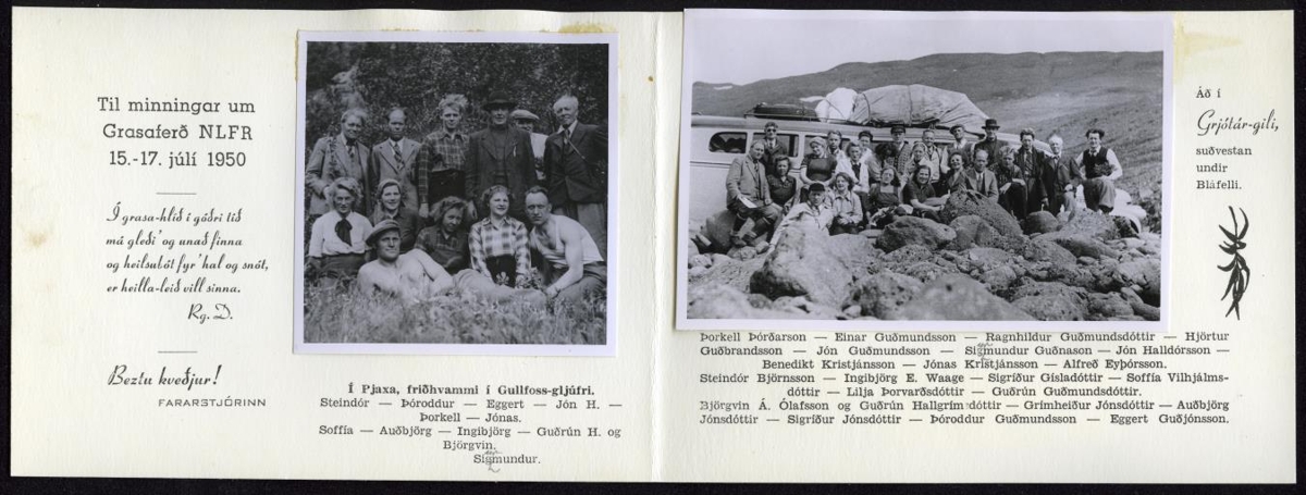 Hópmyndir 2, límdar upp á tvöfalt spjald. Frá grasaferð Náttúrulækningafélags Íslands 1950. Hópmyndir 2, límdar upp á tvöfalt spjald. Frá grasaferð Náttúrulækningafélags Íslands 1950: Jónas Kristjánsson læknir, Einar Guðmundsson kennari Reykjavík, Þóroddur Guðmundsson rithöfundur Hafnarfirði, Jón Guðmundsson vélgæzlumaður Reykjavík, Jón Halldórsson innheimtumaður Reykjavík, Sigmundur Guðnason verkamaður Reykjavík, Þorkell Þórðarson sjómaður Reykjavík, Sigríður Jónsdóttir saumakona Reykjavík, Grímheiður Jónsdóttir saumakona Reykjavík, Auðbjörg Jónsdóttir afgreiðslukona Reykjavík, Alfreð Eyþórsson húsvörður Reykjavík, Sigríður Gísladóttir saumakona Reykjavík, Guðrún Guðmundsdóttir húsfreyja Akranesi, Ingibjörg Eggertsdóttir Waage húsfreyja Reykjavík, Eggert Guðjónsson húsasmiður Reykjavík, Ragnhildur Guðmundsdóttir hjúkrunarkona Reykjavík, Hjörtur Guðbrandsson bilstjóri Reykjavík, Benedikt Kristjánsson húsgagnasmiður Reykjavík, Soffía Vilhjálmsdóttir iðnaðarkona Reykjavík, Lilja Þorvarðsdóttir iðnaðarkona Reykjavík, Guðrún Hallgrímsdóttir saumakona Reykjavík, Björgvin Ólafsson verkamaður Reykjavík, Steindór Björnsson frá Gröf.