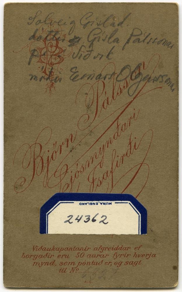 Til baka í leitVeistu meira?Vista í mitt safnPrentaAfrita slóðPanta myndNotkunarskilmálarKonaVarðveitt hjáÞjóðminjasafn ÍslandsDóttir Gísla Pálssonar bónda á Grund?Aðrar upplýsingarLjósmyndari: Björn Pálsson Solveig Gísladóttir, Á myndEfniSvart/hvít pósitíf, Annars konar pósitífSafnnúmerSafnnúmer A: Mms-24362Stærð9 x 6 cmAðfangategundLjósmyndirUndirskrárUndirskrá: Mannamyndasafn (Mms)FlokkunMannamyndirEfnisorð / HeitiMyndefni: KonaHeimildirAðfangabók Þjóðminjasafns Íslands. Nr. 21806 - 25504.