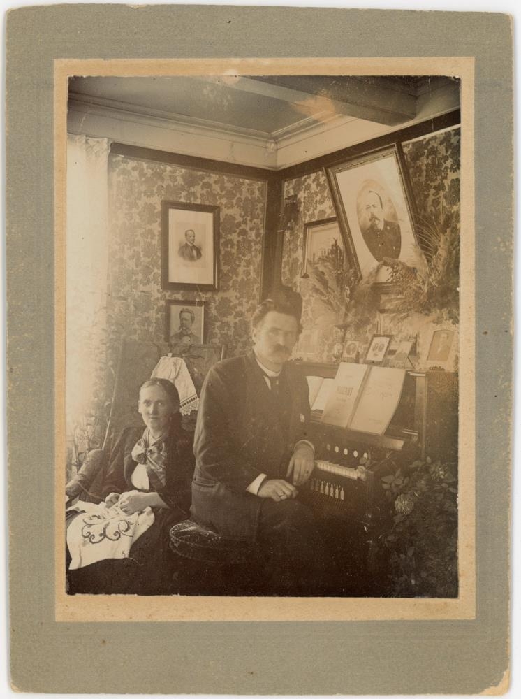 Þau sitja innandyra í stofu, Bjarni situr við orgel eða harmonium og Sigríður situr á stól og saumar út. Á veggjum stofunnar er mynstrað veggfóður og nokkrar mannamyndir hanga uppi. Í stofunni eru einnig pottaplöntur og þurrkaðir blómvendir.