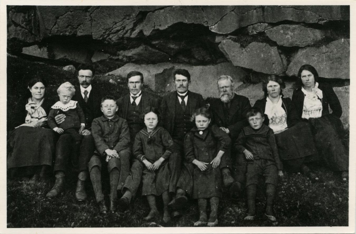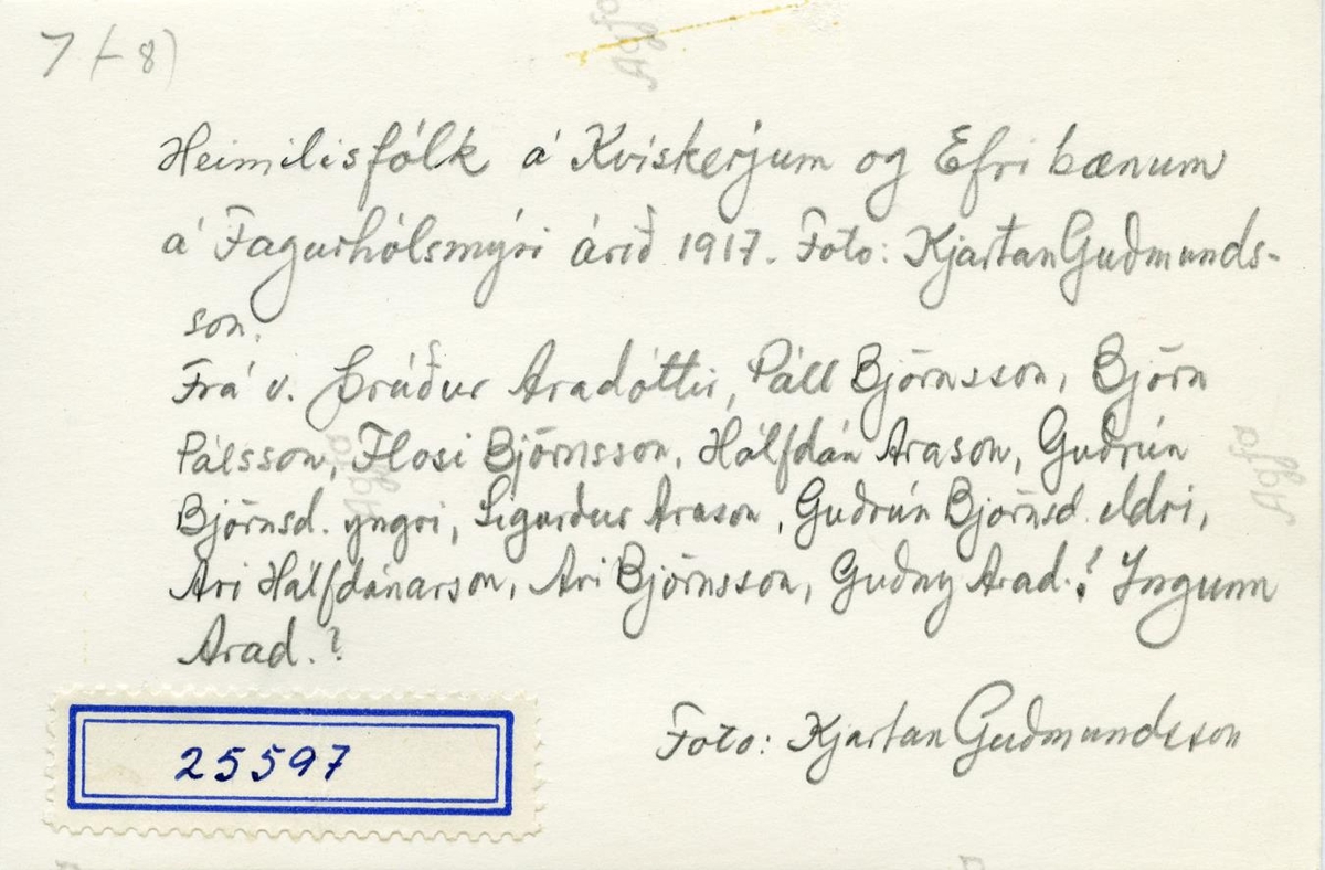 Ljósm. vís.: Hópm., heimlisfólk á Kvískerjum og Efri bænum á Fagurhólsmýri árið 1917. Myndina tók Kjartan Guðmundsson. Ljósm. vís.: Hópm., heimlisfólk á Kvískerjum og Efri bænum á Fagurhólsmýri árið 1917. Frá v.: Þrúður Aradóttir, Páll Björnsson, Björn Pálsson, Flosi Björnsson, Hálfdán Arason, Guðrún Björnsdóttir yngri, Sigurður Arason, Guðrún Björnsdóttir eldri, Ari Hálfdánarson, Ari Björnsson, Guðný Aradóttir?, Ingunn Aradóttir?. Myndina tók Kjartan Guðmundsson.