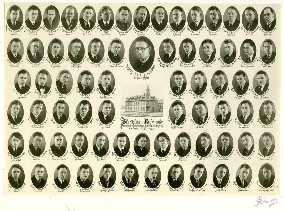 Skólaspjald, Iðnskólinn í Reykjavík, kennarar og nemendur fjórða bekkjar