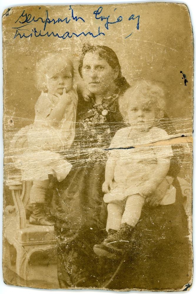 Geirþrúður Zoëga (Thorlacius), hálfsystir Oscars Clausen, með tvö lítil börn. Á myndina er skrifað: Geirþrúður C.. Tvíburarnir.