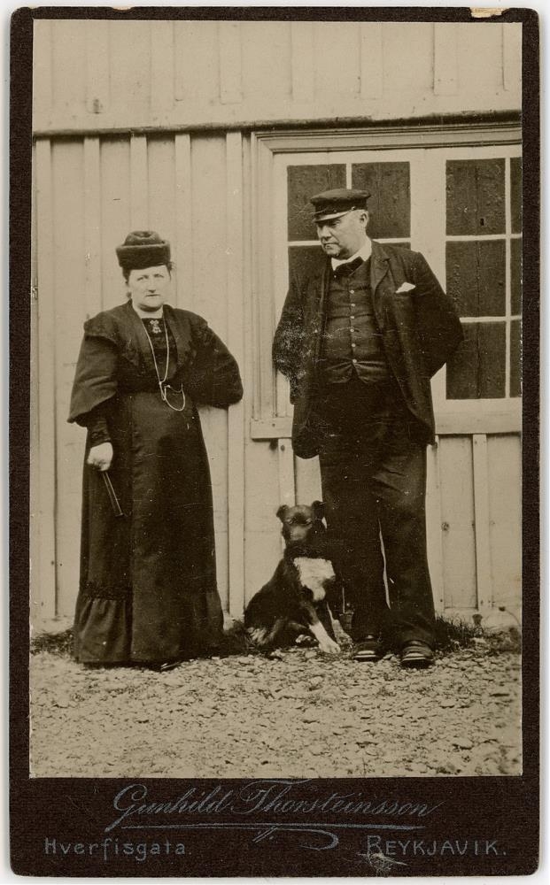 Eldri hjón standa fyrir framan húsvegg, við fætur þeirra situr hundur.