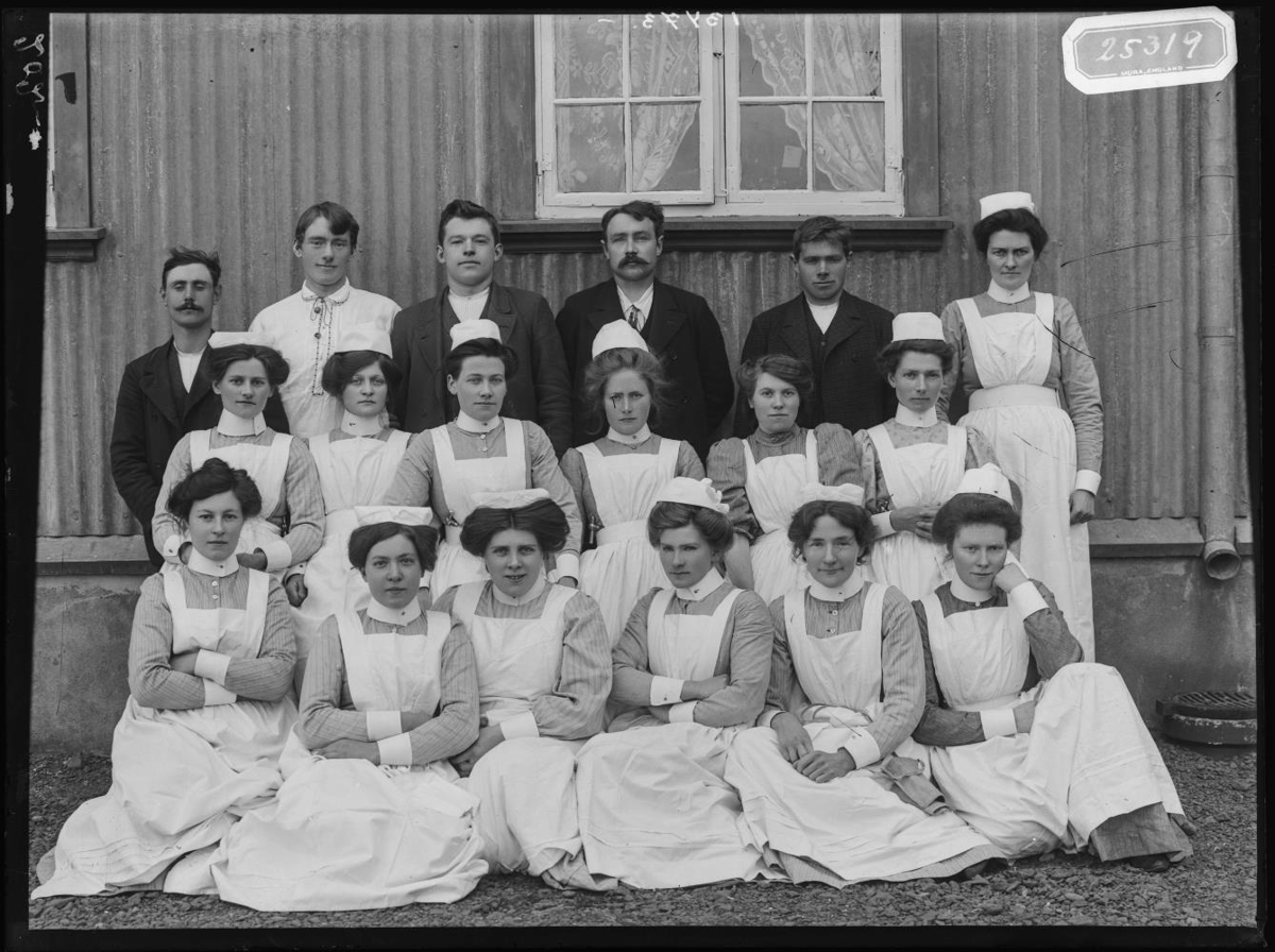 Starfsfólk á Vitfirringahælinu að Kleppi. Starfsfólk á Vitfirringahælinu að Kleppi. Efsta röð: Erlendur, Nicolaj Hansen, Kristinn Indirðason, Elías - og Margrét Guðmundsdóttir, Miðröð: María Guðmundsdóttir, Sigríður Guðjónsdóttir, Ingibjörg Nikulásdóttir, Anna Runólfsdóttir, óþekkt, óþekkt, Fremsta röð: Guðbjörg - Kristín Pálmadóttir, Þórhildur Eiríksdóttir (g. Sandholt og síðar Magga J. Magnús), Þuríður Jónsdóttir, Borghildur - , og Þóra J. Einarsson (g. Bjarna Hávarðarsyni Ísafirði).