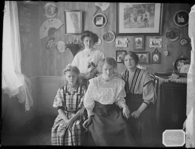 Uppstillt mynd af fjórum ungum stúlkum sitjandi í stofu. Myndir hanga á veggjum í bakgrunni. Veggfóður á vegg. Guðrún Thorsteinsson Liverpool, Guðrún Zoëga (dóttir gamla Geirs), Guðrún Helgadóttir Zoëga og Guðrún Geirsdóttir (rektors) Zoëga.