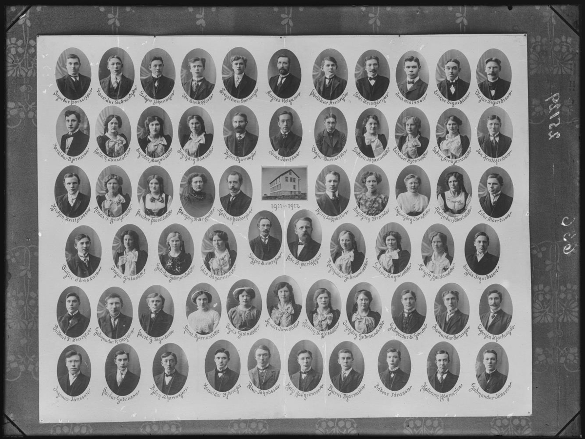 Kennarar og nemendur Kennaraskólans veturinn 1911-12: Sigurður Þorkelsson, Haraldur Guðmundsson, Guðgeir Jóhannsson, Jón Eiríksson, Freysteinn Gunnarsson, sra Magnús Helgason, Þorlákur Arnórsson, Gísli Kristjánsson, Jens Níelsson, Eiríkur Sigurðsson og Ólafur Sigurðsson, Haraldur Björnsson (leikari), Halla R. Jónsdóttir, Sigríður Magnúsdóttir, Ingibjörg Jónsdóttir, Jónas frá Hriflu, dr. Ólafur Dan., Guðrún Jóhannsdóttir, Elísabet Björnsdóttir, Guðrún Arnbjarnardóttir, Jón Kristófersson, Kristján Kristjánsson, Arndís S. Kristjánsdóttir, Þuríður Þorvaldsdóttir, Þorbjörg Friðriksdóttir, Matthías Þórðarson þjóðm. vörður, Björn Jakobsson og Ingibjörg Brands, leikf., kennarar, Sigurbjörg Jónsd., Aðalheiður Albertsd., og Eiður Albertsson, Ólafur Jónsson, Ingunn Gísladóttir, Guðríður Guðmundsdóttir, Lára Jóhannesdóttir, Sigfús Einarsson, söngkennari, Þórarinn B. Þorláksson listmálari, Ragnhildur Guðmundsd., Guðrún Magnúsdóttir, Margrét Halldórsdóttir og Sigfús Sigurðsson, Friðbert Friðbertsson, Guðmundur R. Ólafsson, Þorsteinn G. Sigurðsson, Anna Bjarnadóttir (frá Sauðafelli?), Vigdís Gísladóttir (frá Stafholti?), Arndís Jónsdóttir, Kristín Vigfúsdóttir, Ingibjörg Guðmundsdóttir, Guðmundur Eyjólfsson Geirdal (Ísaf.), Sæmundur Einarsson og Sigurjón Kjartansson, Ingimar Jónsson, Þórður Guðnason, Björn Jóhannsson, Hervaldur Björnsson, Pétur Jakobsson, Helgi Hallgrímsson, Bjarni Bjarnason (Laugarvatni), Böðvar Jónsson, Kolbeinn Högnason og Guðmundur Jónsson.