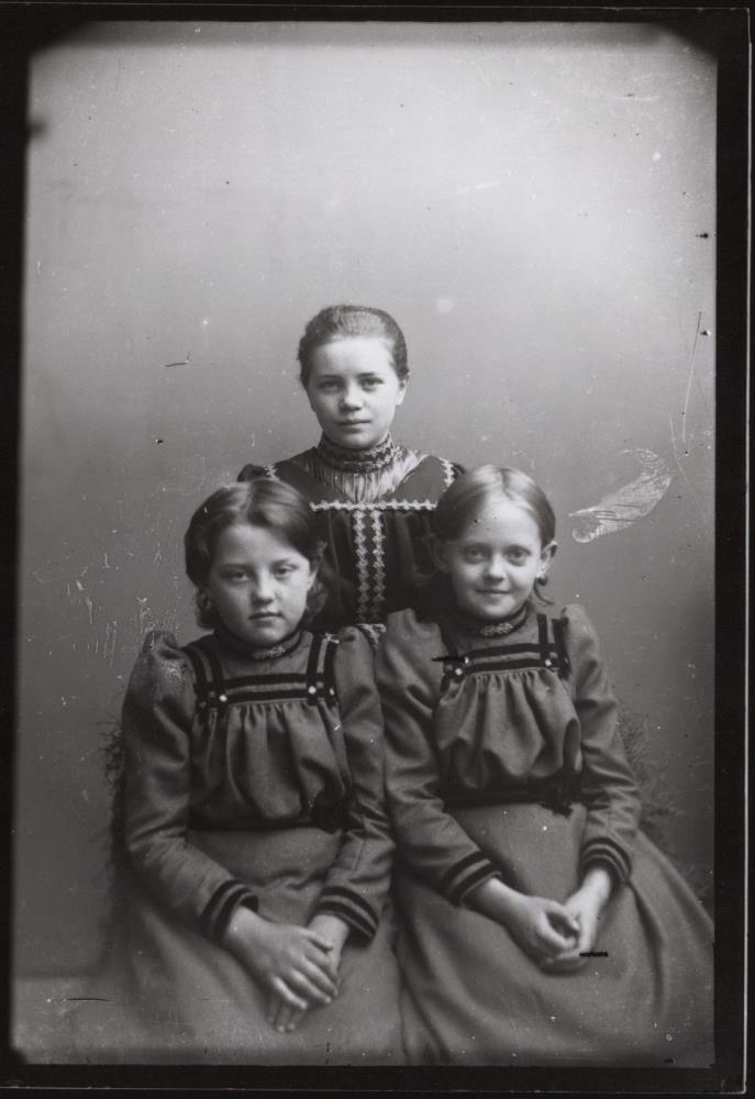 Aftast er sennilega Gyða Pétursdóttir Thorsteinsson, dó ung. Í fremri röð f.v. eru tvíburarnir Hildur Soffía Thorsteinsson og Guðrún Þorsteinsdóttir Thorsteinsson. Frænkur. Feður þeirra voru hálfbræður.
