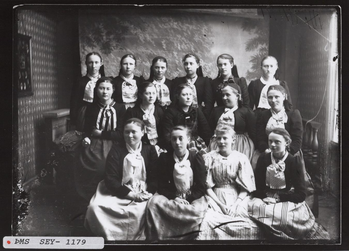 Hópmynd, 15 ungar konur. Anna Bernburg, 4 f.v. í neðstu röð, Kristín Petersen, 3 f.v. í neðstu röð, Ragnheiður Þórðardóttir, 2 f.v. í neðstu röð.